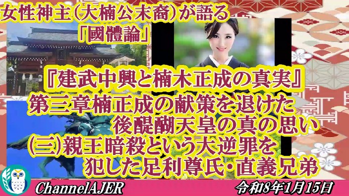 女性神主が語る國體論「第三章楠木正成の献策を退けた後醍醐天皇(三)親王暗殺という大逆罪を犯した足利尊氏・直義兄弟」山下弘枝 AJER2026.1.15(2)