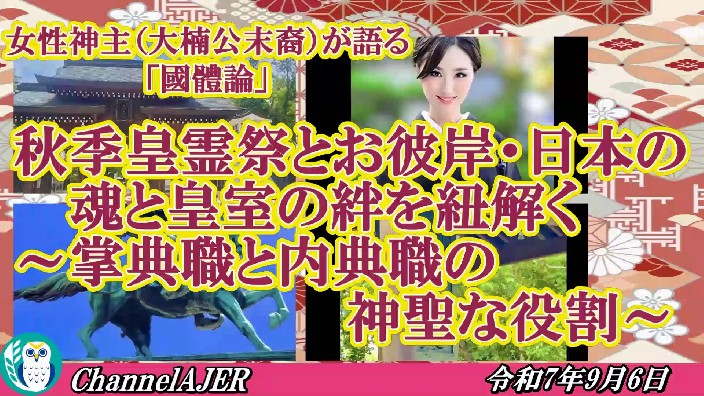 女性神主が語る國體論「秋季皇霊祭とお彼岸・日本の魂と皇室の絆を紐解く~掌典職と内掌典の神聖な役割~」山下弘枝 AJER2025.9.6(3)