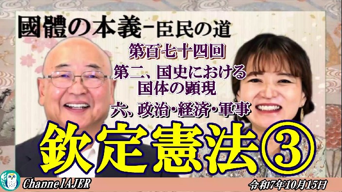 『国体の本義』第2国史における国体の顕現 6.政治・経済・軍事ー欽定憲法③」小名木善行&佐波優子AJER2025.10.15(3)