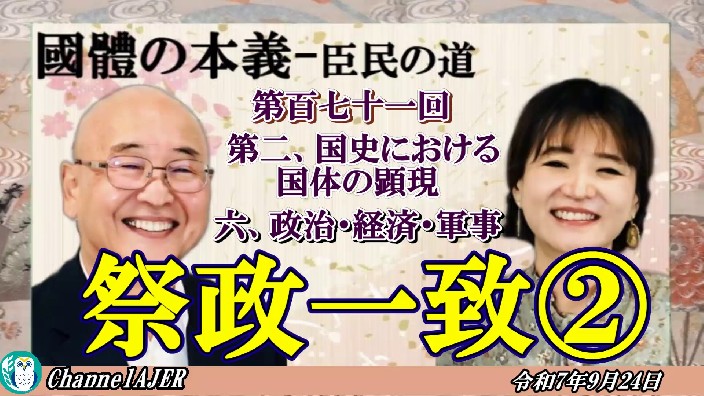 『国体の本義』第2国史における国体の顕現 6.政治・経済・軍事ー祭政一致②」小名木善行&佐波優子AJER2025.9.23(3)